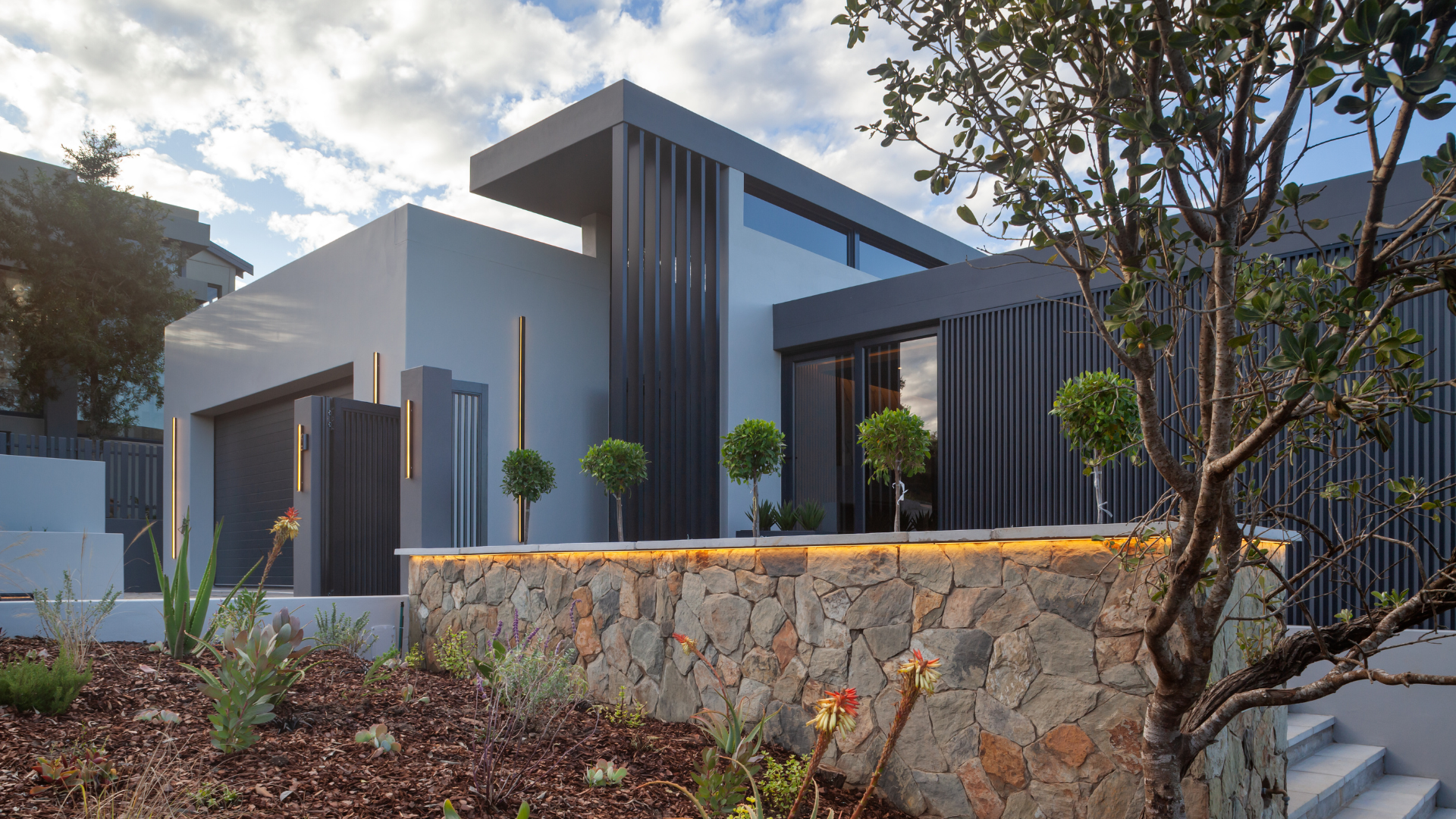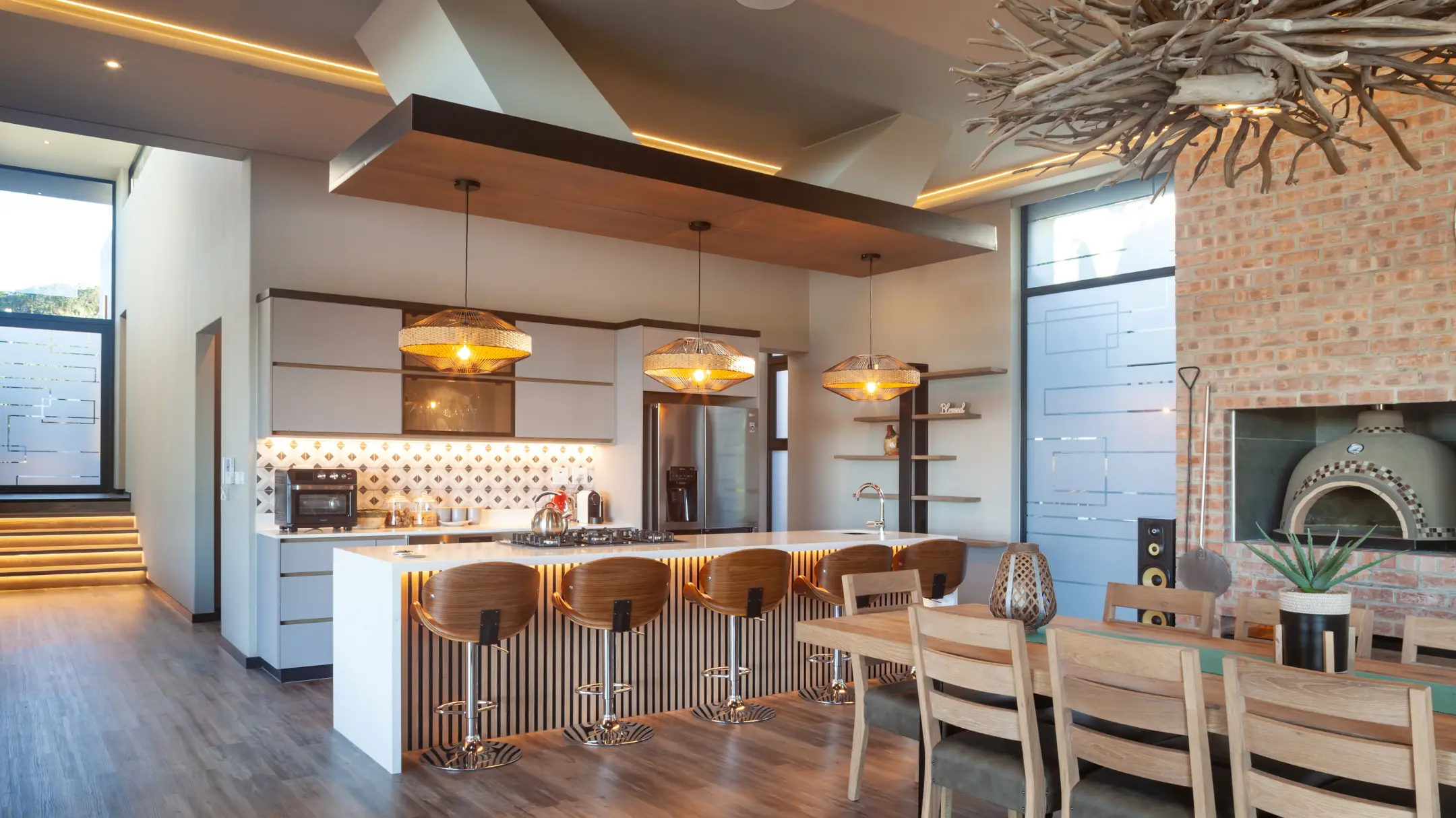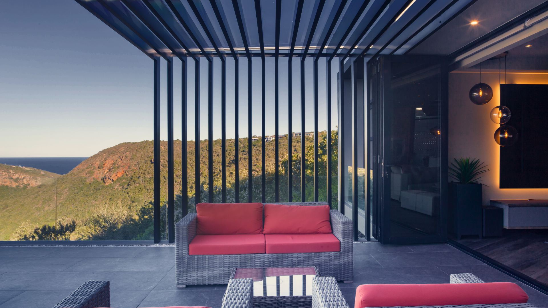 Inside contemporary elegance unfolds in layers of texture and light. Timber floors meet raw stone walls, while vast panes of glass frame natures ever changing canvas.